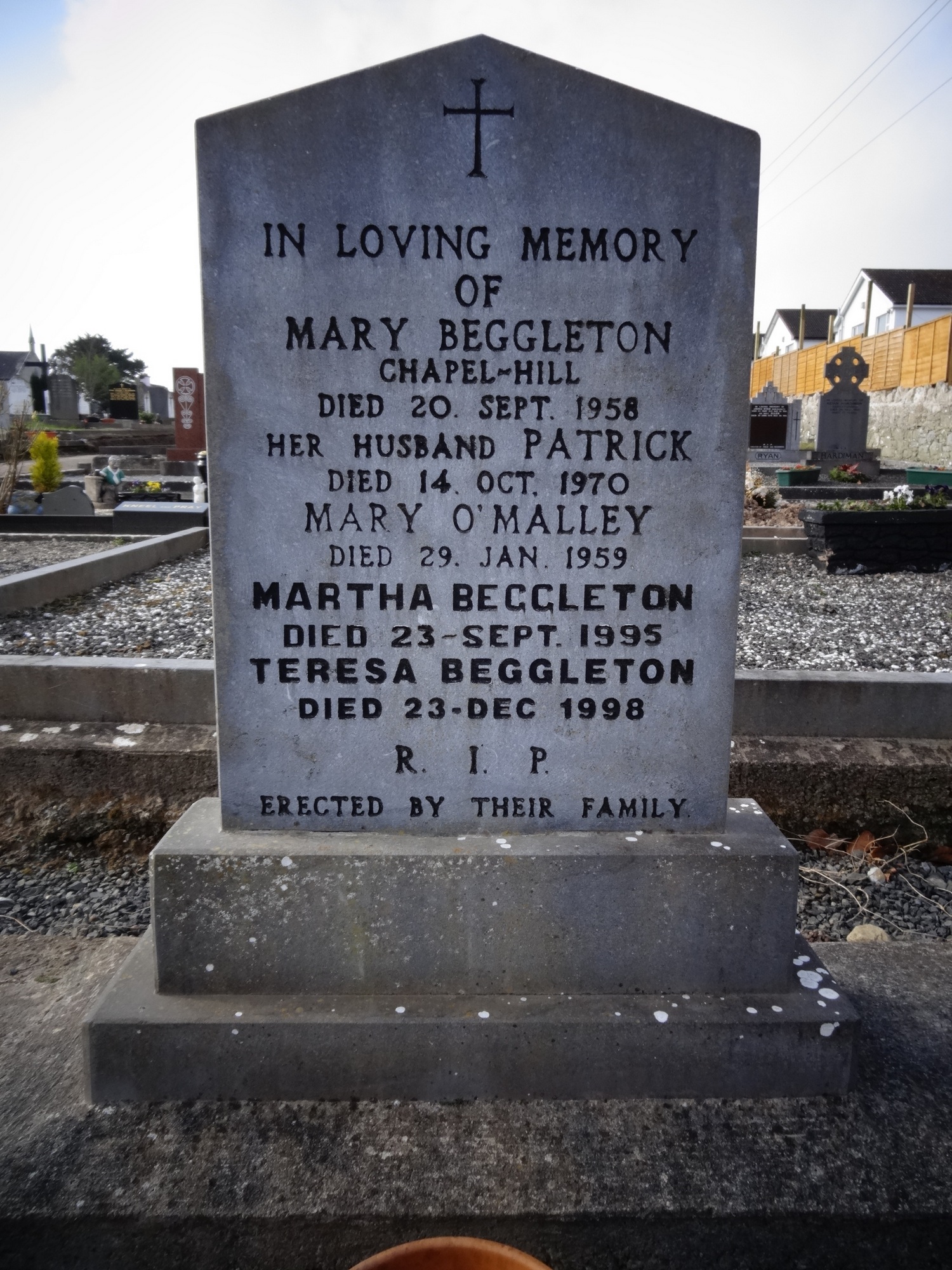 IN LOVING MEMORY OF MARY BEGGLETON CHAPEL-HILL DIED 20.SEPT.1958 HER HUSBAND PATRICK DIEDE 14.OCT.1970 MARY O'MALLEY DIED 29.JAN.1959 MARTHA BEGGLETON DIED 23-SEPT.1995 TERESA BAGGLETON DIED 23-DEC 1998