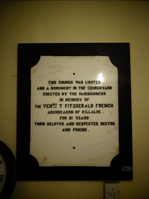 This church was lighted and a monument in the churchyard erected by the parishioners in memory of The Venble T Fitzgerald French Archdeacon of Killaloe. for 21 years their beloved and respected Rector and friend.