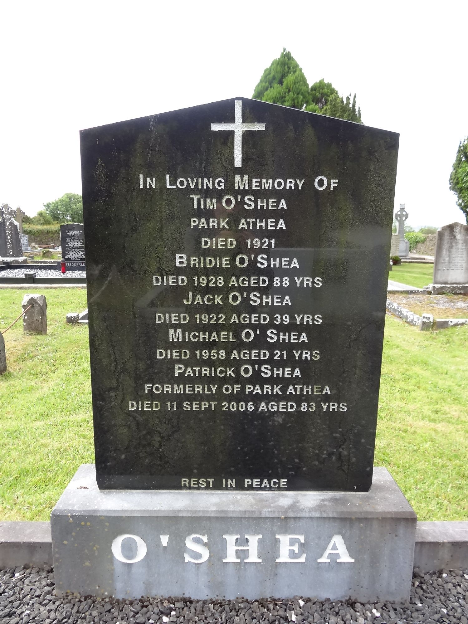 In loving memory OfTIM O'SHEAPark AtheaDied 1921BRIDIE O'SHEADied 1928 Aged 88 YrsJACK O'SHEA Died 1922 Aged 39 YrsMICHAEL O'SHEADied 1958 Aged 21 YrsPATRICK O'SHEAFormerly Of Park AtheaDied 11 Sept 2006 Aged 83 Yrs