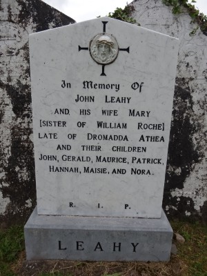 In Loving Memory OfJOHN LEAHYAnd His Wife MARY(Sister Of WILLIAM ROCHE)Late Of Domadda AtheaAnd Their ChildrenJOHN, GERALD, MAURICE, PATRICK,HANNAH, MAISIE and NORA.