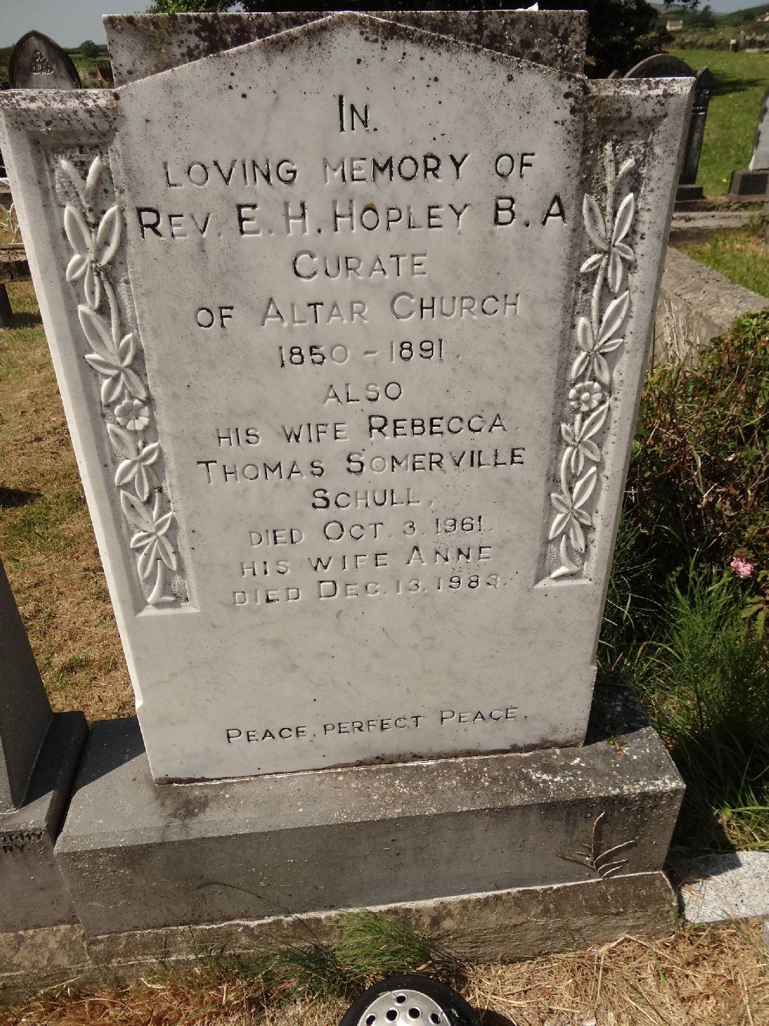 InĀ Loving memory of Rev E.H. Hopley B.A.Curate of Altar Church1850 - 1891also his wife RebeccaThomas SomervilleSchulldie Oct 3. 1961his wife Anne died Dec 13. 1983