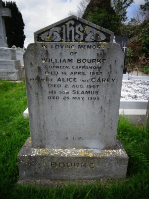 In loving memory of William BourkeCooneen Cappamoredied 18 April 1952his wife Alice (nee Carey)died 2 Aug 1967his son Seamus died 25 May 1995RIP