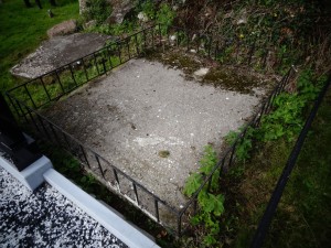 uninscribed grave plot, concrete covered with low metal railing surround