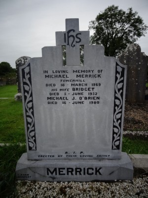 In loving memory of Michael MerrickTowerhilldied 18 March 1969his wife Bridgetdied 5 June 1952Michael J O' Briendied 16 June 1980RIPerected by their loving familyMerrick